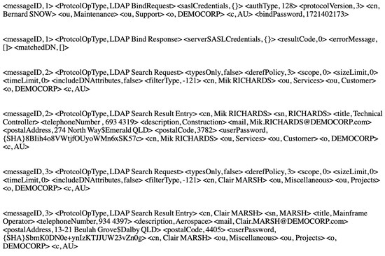 The Lightweight Directory Access Protocol (LDAP), is a versatile and standards-based protocol for communicating with directory servers [26]. It is applied for authentication and recording information. LDAP data set is a set of real recorded transactions between an LDAP server and its client provided by the industry partner. It contains 4265 messages with different types namely, LDAP Bind Request, LDAP Bind Response, LDAP Add Request, LDAP Add Response, LDAP Compare Request, LDAP Compare Response, LDAP Delete Request, LDAP Delete Response, LDAP Modify DN Request, LDAP Modify DN Response, LDAP Modify Request and LDAP Modify Response, LDAP Search Request, LDAP Search Result Done, LDAP Search Result Entry and LDAP Unbind Request.