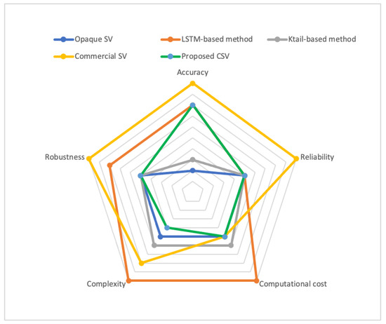 Moreover, due to the variety of protocols and security requirements, they may require a different level of decryption methods prior to virtualisation. Therefore, no automatic systems can deal with decrypted protocols; thus, low robustness is obtained. However, because the commercial SV solutions use the service specifications, they can handle all the necessary decryption levels and have high robustness. The proposed CSV and the commercial SV can incorporate long-term dependencies, whereas the other methods only cover short-term dependencies. Figure 9 visually compares the proposed CSV method with state-of-the-art methods on five main benchmarks, namely, accuracy, reliability, computational cost, complexity and robustness.
