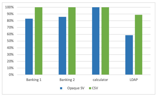 We compared CSV with four different recent works on the basis of several benchmarks. Amongst them, only opaque SV provides a viable and practical solution, which is used to address the actual problem in the industry, due to some limitations of the other SV solutions. Therefore, in this section, we select opaque SV to compare with the proposed solution quantitatively. Figure 10 shows the comparison between opaque SV and CSV results whilst generating categorical fields on the first banking, second banking, calculator and LDAP data sets. The first 90% of each data set are used as training set and the last 10% as test set. Here, accuracy is the ratio of accurately generated categorical values in the response messages to the number of all categorical values in all generated responses. The comparison chart shows that CSV obtains 100%, 100%, 100% and 88.7% accurate categorical fields for first banking, second banking, calculator and LDAP data sets, respectively. However, opaque SV can generate 100% accurate results for calculator data set, which contains only constant fields while generating 83%, 86% and 58.6% accurate categorical fields on the second, third and LDAP data sets, respectively.