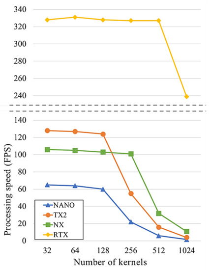 The difference in the processing speeds is significantly reduced due to the parallel processing power of the GPU. As shown in Figure 1, in NANO, the processing speed decreased slightly when the number of kernels was 128, and rapidly decreases more at 256. TX2 has no significant change in the processing speed until it reaches 128 kernels, but a significant decrease occurs at 256 and a rapid decrease occurs at 512 kernels. In the case of NX, while maintaining similar processing speed until it reaches 256 kernels, a significant decrease occurs at 512 or higher kernels. NX performs lower processing speed than TX2 in less than 128 kernels, but it achieves faster processing speed in 256 or more kernels. This is because TX2 has a single GPU clock speed of 1300 MHz, which is higher than NX’s 1100 MHz, so even though NX has higher parallel processing power, TX2 achieves faster processing speed in a small number of kernels that can perform the same parallel processing power. On the other hand, the Titan RTX which is a high-performance GPU for server-computing, maintains the same processing time even at 512 kernels, and a significant decrease occurs at 1024 kernels, but it still shows superior computing power when compared other edge-computing devices.