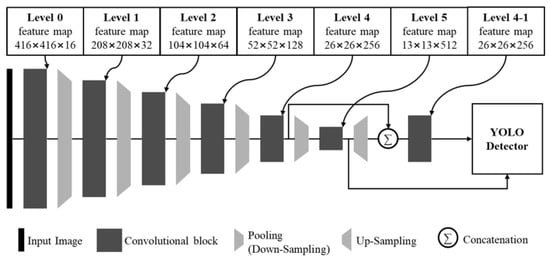 YOLO detector uses the final two or three feature maps. Therefore, up to level 0 to 2 feature maps, pooling continues by using the convolutional layer with stride 2, and this part quickly transfers the input image to a feature domain. For the first feature extraction part, i.e., from level 3 to level 5 feature map, the proposed scalable convolutional blocks are used because it is necessary to increase the non-linearity of the feature maps to improve the detection performance. The maxpooling method was used for pooling from level 3 to level 5 feature map. After the pooling layer, the dense convolutional block is applied to increase the number of channels in the feature map. To increase the non-linearity of the feature maps, the dense convolutional blocks can be expanded by adding the residual convolutional blocks after the dense convolutional block such as dense-residual convolutional block in Figure 3e. Figure 4 shows an example of using the dense-residual convolutional block which extends the dense convolutional block for level 3 to level 5 feature maps and level 4-1 and level 5-1 feature maps.