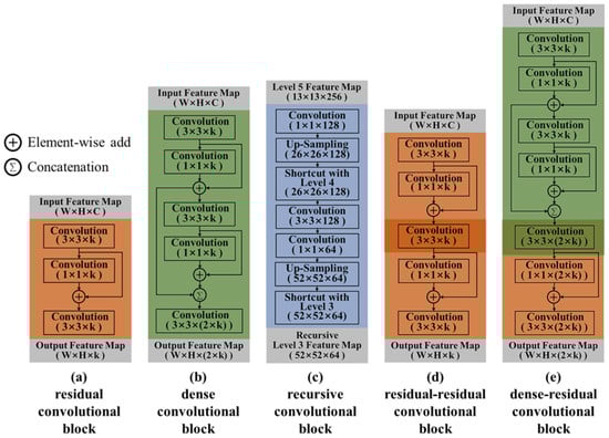 Figure 3 shows the scalable convolutional blocks to be used in the SF-YOLO as proposed in this paper. Figure 3a is the residual convolutional block inspiring the concept of a residual network which is the basis of the SF-YOLO that is used to replace a single convolutional layer. It consists of a 3 × 3 convolutional layer and a 1 × 1 convolutional layer. The shortcut layer performs an element-wise addition of these two convolutional layers. This block analyzes the correlation between the spatial feature values of the feature map through the 3 × 3 convolutional layer and analyzes the correlation between the channels of the feature map through the 1 × 1 convolutional layer. The 1 × 1 convolutional layer was mainly used as the bottleneck layer to control the number of channels in the feature map. In this study, since the ×1 convolution layer is used to analyze the correlation between the channels in the feature map, the same number of kernels as in the 3 × 3 convolutional layer is used in this layer. The residual convolutional block affects the analysis of the neighboring feature values and the correlation between channels and results to minimize the increase in the computational complexity. Figure 3b shows the dense convolutional block concept of the dense network to double the number of channels after the pooling layer. The feature map with 2 × k channels is generated by concatenating the resulting feature maps output of two k-channel residual convolutional blocks. The dense convolutional block slightly decreases the computational complexity as compared to the method of doubling the number of channels using the single convolutional layer with 2 × k kernels, and the non-linearity of the feature map is increased by using the deeper convolutional layers. The recursive convolutional block in Figure 3c performs a returning function to the lower feature map while up-scaling the final feature map to compensate for insufficient feature extraction by using some little convolutional layers. The level 5 feature map of 13 × 13 dimensions is up-scaled to the feature map of 26 × 26 dimensions and an element-wise addition is performed with the level 4 feature map of 26 × 26 dimensions. All through this same process, it is recursive until it gets to the level 3 feature map of 52 × 52 dimensions. Figure 3d,e shows the scalability of the scalable convolutional blocks proposed. The residual and dense blocks can be stacked continuously. Since the scalable convolutional layers have the same size of blocks within its layers, the layers can be shared for the light-weight models. Each scalable convolutional block is expandable when necessary. While using this expandable feature, the processing speed and accuracy can be easily adjusted according to the performance of the various edge-computing devices with different computing powers.