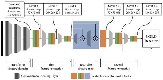 The SF-YOLO detector is designed by using the proposed scalable convolutional blocks. Figure 4 shows the block diagram of the proposed SF-YOLO (medium) architecture, and Table 2 describes the architecture of the SF-YOLO for cases where the input is 416 × 416 dimensions. The SF-YOLO consists of four parts namely: transfer to feature domain, first feature extraction, recursive feature map, and second feature extraction. Like the YOLOv3-tiny, the SF-YOLO transforms the input image of 416 × 416 × 3 dimensions into the feature map of 13 × 13 × C dimensions through the five pooling layers. From the result of the preliminary experiment, limiting the kernel of the convolutional layers to 256 or less is an advantage for the processing speed. Therefore, the number of kernels for all convolutional layers was limited to 256, hence making the number of channels in the level 5 feature map of the SF-YOLO to be 256.