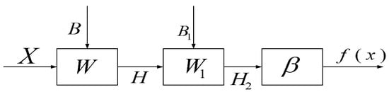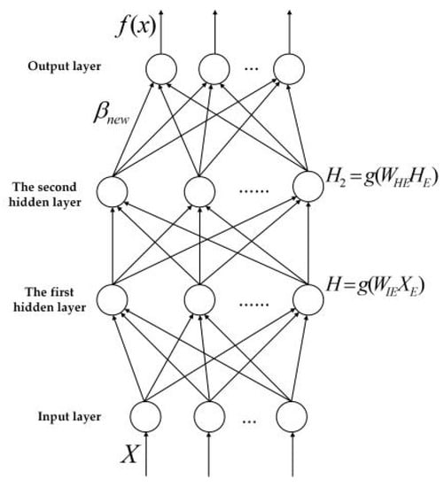 (3) Randomly select values for the weight ω2 and threshold B2 of the second hidden layer, and calculate the output matrix H2 of the second hidden layer by H2 = [g(ω2 × H1)+b2];
