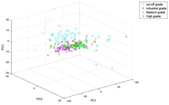 Principal component analysis (PCA) [22] is a simple and effective method for data processing, compression and dimensionality reduction [23,24,25]. It can use a small amount of data to retain the most important characteristics of the original data. PCA uses the direction of the largest variance of the original data as the projection, because the maximum variance of the data gives the most important information contained in the data. PCA can remove useless noise and reduce a lot of computation. Therefore, we used PCA to preprocess the original spectral data of copper ore.