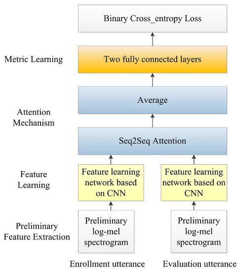 Inspired by human attention behavior [28], a recent trend in TDSV is to build deep learning-based TDSV systems with attention mechanisms [7,19]. Most of the existing methods aim to combine the frame-level features via the combination weights learned from the attention model. These methods extract the utterance-level features for each utterance separately, and thus neglect the joint information between enrollment and evaluation utterances, as in [17,19]. To address this concern, Zhang et al. from Tencent AI Lab proposed a sequence-to-sequence attentional Siamese model, and generated an enrollment evaluation joint vector for each pair of enrollment and evaluation utterances [7]. The architecture of this TDSV model is shown in Figure 2, and includes feature learning, an attention mechanism, and metric learning. In the feature learning section, the model learns the frame-level features from the primary log-mel spectrogram. Then, the sequence-to-sequence model is used to compute the attention weights for the temporal alignment between the features obtained at the previous feature learning stage. Finally, at the metric learning stage, two fully connected layers, with 108 units and one unit, respectively, determine whether these two utterances are from the same speaker.