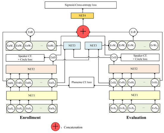 We trained the overall network based on a two-step strategy, including the first step to pre-train NET1 and NET2 for effective speaker representations and the second step for jointly training all four NETs. The overall network is optimized via the stochastic gradient descent (SGD) approach [30]. The optimization formulas can be written as: