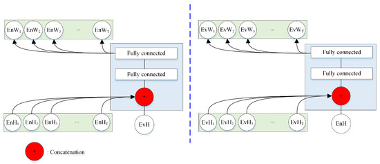 Utterance-level hidden vectors, and , are derived from deep convolutional network separately, and are employed as the constant d-vectors to represent the speaker identity [26]. However, these d-vectors do not consider the joint-information between enrollment and evaluation utterances. In this work, we employ a bidirectional attention model to mimic humans’ selective auditory attention [28,29]. For each pair of compared utterances, we extract the interactive speaker representation of either utterance in consideration of the information from the other one, and obtain the corresponding features for speaker verification, and . We evaluated the performance obtained when using features at different levels, including the utterance-level hidden features and , which are constant, the speaker representations via bidirectional attention, and , which are interactive, and their combination. As shown in Table 3, the combination of these two kinds of features provided the best performance. Compared with the traditional method based on utterance-level hidden features, the proposed method achieved a 4.27% and 5.44% relative decrease of on the development set and test set, respectively. In addition, we evaluated the performance of unidirectional attention, where the speaker representation of either enrollment utterance or evaluation utterance is assumed to be constant. The combination of , , and provided comparable performance on the development set, whereas it showed higher on the test set. This performance suggests that the joint information between two utterances is complementary to the traditional d-vector.