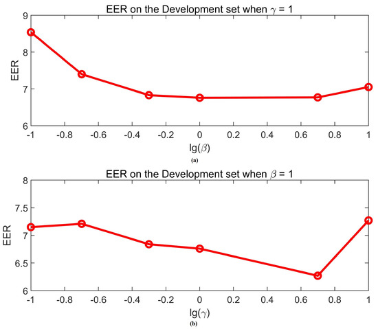 The equal error rate () corresponding to different weights of losses. (a) the on the development set when ; (b) the on the development set when .
