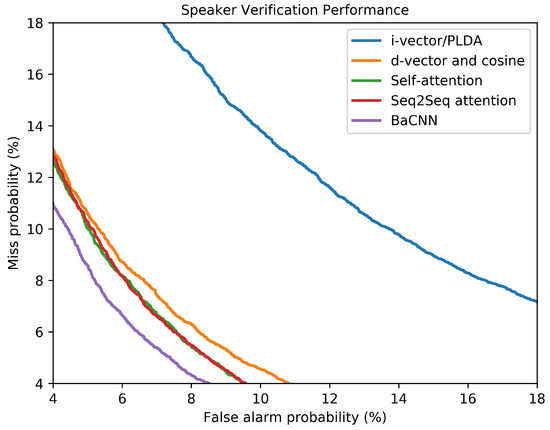 If all the parameters of these four NETs are randomly initialized and jointly optimized (denoted as BaCNN-1step), the performance is not competitive. At the early stage of the training, it is difficult to provide effective attention due to the inaccurate constant speaker representations (i.e., and ). Therefore, the model cannot quickly converge to a relatively good solution. After pre-training of NET1 and NET2, the joint training of NET3 and NET4 provided better performance. The corresponding had a relative decrease of 17.5% and 9.41% compared to that of the BaCNN-1step on the development set and test set, respectively. In addition, the DET curves in Figure 6 show a comparison with the state-of-the-art TDSV methods mentioned above, and further demonstrate that the improvements were consistent across operating points.