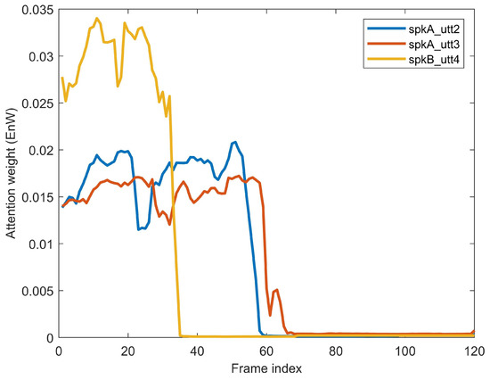 In order to illustrate the effectiveness of the proposed bidirectional attention mechanism, we further analyzed the attention weights corresponding to different pairs of enrollment and evaluation utterances. We randomly selected utterance1 of speaker A (denoted as ) as the enrollment utterance and explored the distribution of when utterance2 and utterance3 from speaker A (denoted as and , respectively), and utterance4 from speaker B (denoted as ) are used as the evaluation utterance. As shown in Figure 7, the horizontal axis represents the index of frames and the vertical axis represents the corresponding coefficient of . The follow a similar distribution when the evaluation utterances are from the same speaker. For instance, the corresponding to is highly correlated with that corresponding to . However, similar to human selective attention [29], the differ greatly when the evaluation utterances are from different speakers. For instance, the BaCNN model payed more attention to the first 58 frames of when comparing it with , whereas it payed more attention to the first 35 frames of when comparing with . The attention weights for the enrollment utterances varied with evaluated speakers. This also indicates that the BaCNN model does learn interactive speaker representations for different speakers.