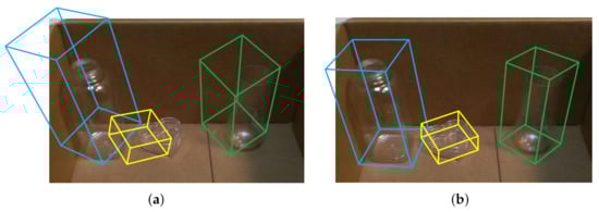 Pose estimation results of transparent objects. (a) DenseFusion [2], (b) Our proposed approach. The object pose is expressed as tight oriented bounding box of the object model. DenseFusion [2] is one of the state-of-the-art methods for 6DoF object pose estimation from a single RGB-D image.