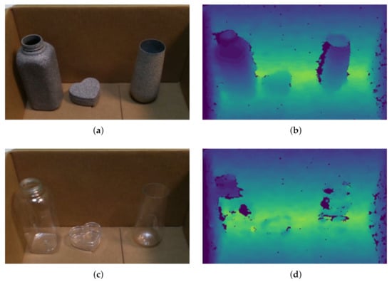 Depth errors of transparent objects: (a) RGB-channel of non-transparent objects; (b) D-channel of non-transparent objects; (c) RGB-channel of transparent objects; and (d) D-channel of transparent objects. For the transparent objects, there exist two types of depth error in the D-channel. The depth error dramatically distorts the 3D geometric information of transparent objects observed.