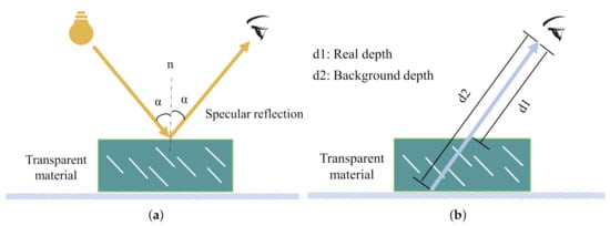 Cause of depth error of transparent material: (a) depth error of Type I is caused by specular reflection; and (b) depth error of Type II is caused by light passing through transparent material.