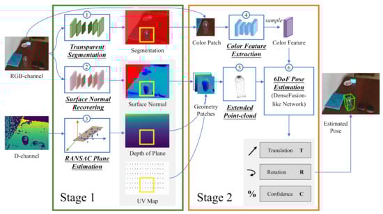 This work aims to predict the 6DoF pose of known transparent object in the camera coordinate frame using a single RGB-D image. The object pose is represented by a 3D rigid transformation with rotation and translation . Normally, there exist multiple object instances within one image. For each segmented object instance, the proposed approach estimates the object pose through a two-stage framework, as shown in Figure 4. In the first stage, there are three modules: transparent segmentation, surface normal estimation, and RANSAC plane estimation. The results of the first stage are fed into the second stage for further processing. In the second stage, there are three modules: extended point-cloud, color feature extraction, and 6DoF pose estimation. These six modules are the key subsections of our approach. Details are described as follows.