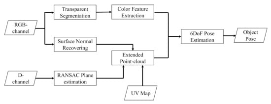 In this paper, we propose an accurate and efficient approach for 6DoF pose estimation of transparent object from a single RGB-D image. As illustrated in Figure 4, the proposed approach contains two stages: In the first stage, we eliminate the influence of depth errors by transparent segmentation, surface normal recovering, and RANSAC plane estimation. In the second stage, an extended point cloud representation is constructed based on the output of the first stage, and the color feature is extracted from cropped color patch. The extended point-cloud and the color feature extracted are then fed into a DenseFusion-like network structure [2] for 6DoF pose estimation. The block-diagram of our approach is shown in Figure 5. The RGB-channel is fed into the transparent segmentation module to retrieve bounding box and mask of transparent object. Then, the color feature is extracted, the surface normal is recovered, and the plane is estimated. By taking the normal, the plane, and the UV map as inputs, the extended point-cloud is constructed. Finally, based on the color feature and the extended point-cloud, the 6DoF object pose is estimated.