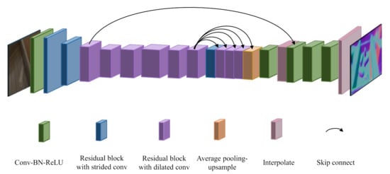 Surface normal recovering. Our surface normal estimation network adopts an encoding–decoding structure which is the same as that of Sajjan et al. [12]. The network structure is shown in Figure 6. Firstly, taking the RGB-channel as input, one convolution layer and several residual blocks are used to obtain low-level features. Secondly, the Atrous Spatial Pyramid Pooling [53] sub-network is used to sample high-level features. It not only captures the context in multi-scale but also retains the global characteristics of feature through average pooling. We apply skip connections between the low-level features and the high-level features to ensure the integrity. Beside, we use many residual blocks with dilated convolution, which increases the receptive field of individual neurons while maintaining the resolution of the output feature map. Thirdly, L2 normalization is applied on the three-channel output of the network, so that the output on each pixel is enforced to be a unit vector, which represents the estimated normal. We calculate the cosine similarity between the estimated normal and ground-truth normal as follows: