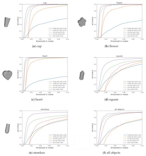 The accuracy–threshold curves of the compared methods are shown in Figure 8. The x-axis denotes the varying threshold in terms of ADD-S, and the y-axis denotes the accuracy according to the threshold. The AUC is the area under the accuracy–threshold curve within the range from 0 to 0.1 m. The accuracy of the compared methods are shown in Table 1, in which the threshold is set to 10% of the object diameter. We observed that FCRN-based methods can efficiently reconstruct depth, but the result is not accurate, as the depth is inferred from RGB-channel only. CG-based methods can accurately reconstruct depth, because both RGB-channel and D-channel are considered in the depth reconstruction process. DF-based methods are stable, even when the estimated depth is not accurate; FCRN + DF still yields sensible result. RA-based methods are accurate; CG + RA outperforms CG + DF when the reconstructed depth is good, but the performance of FCRN + RA degrades when the depth reconstruction is inaccurate. Ours does not rely on depth reconstruction as it directly estimate object pose from estimated normal map, and experimental results show that it is the most accurate among the compared methods.