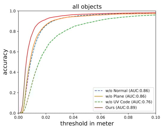 The 6DoF pose estimation accuracy of the three variations are shown in Table 3, and the accuracy–threshold curves of the three variations are shown in Figure 9. The observations are as follows: (1) UV encoding is crucial for extended point-cloud. When the UV code is absent, the accuracy of Ours drops from 85.4% to 33.8%. The pose estimator cannot properly work without UV code. (2) Normal estimation is very important for accurate 6DoF transparent object pose estimation. When the normal is absent, the accuracy of Ours drops from 85.4% to 68.8%. (3) Plane estimation is helpful to improve the accuracy. When the plane is absent, the accuracy of Ours drops from 85.4% to 71.5%.