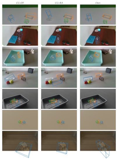 The 6DoF pose estimation results of the compared methods are visualized in Figure 10. Each row corresponds to a scene, and each column corresponds to a method. The first column is the results of CG + DF, the second column is the results of CG + RA, and the third column is the results of Ours. The object pose is shown as tight oriented bounding box of object’s model. Different objects are visualized by boxes with different colors. The results show that Ours accurately estimates transparent object pose in simple scenes (Rows 1 and 6), cluttered scenes (Rows 2 and 4), with occlusions (Rows 4 and 5), and small scale size (Row 6). We also predict truncated objects (partially visible) more accurately than other methods, e.g., the object in the Row 7. Our approach is trained using synthetic images, but the trained model can be robustly applied to real images which are not seen in the training data (please refer to the first four rows of Figure 10).