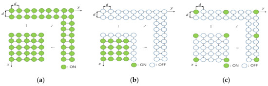 In this paper, we consider a flexible massive antenna array, which is defined as one in which some of the antenna elements can be turned on and some of them can be turned off, depending on the situation, as shown in Figure 1. Figure 1 describes three examples of the flexible massive antenna array; all array elements are turned on in Figure 1a, some concentrated array elements are turned on in Figure 1b, and some scattered array elements are turned on in Figure 1c.