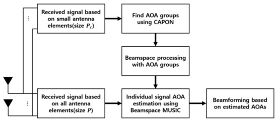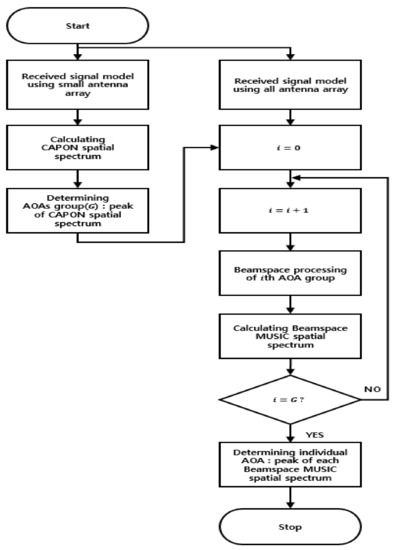 First, we roughly find AOA groups, including multiple signal AOAs for estimating the ranges of the groups, using CAPON. In this process, we use a proportion of the array elements (small size) to roughly estimate their ranges. Next, we estimate the detailed signal AOAs in the estimated AOA groups, using Beamspace MUSIC. In this process, we use all of the array elements (full size) to enable accurate estimation of each AOA. To estimate the detailed AOAs, we scan only the estimated ranges, unlike in conventional AOA estimation techniques, such as MUSIC. In the proposed cascade AOA estimation algorithm, the goals of CAPON and Beamspace MUSIC are to roughly estimate the ranges of existing signal AOAs and to estimate individual signal AOAs in ranges estimated by CAPON, respectively.