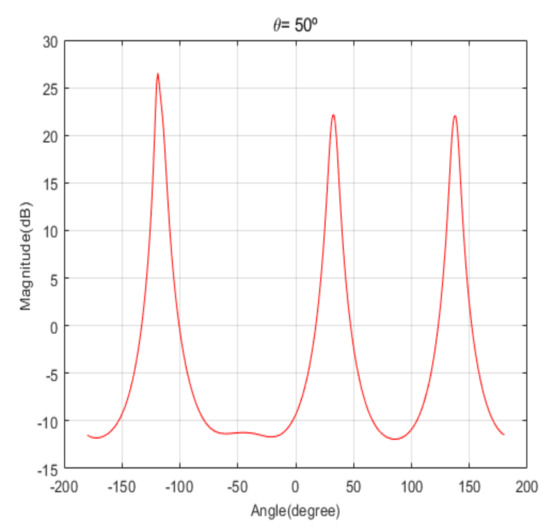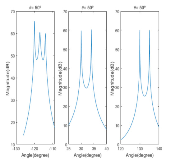 Spatial spectrum of Beamspace Multiple Signal Classification (MUSIC) in the proposed algorithm for the first scenario (elevation angle = 50°).
