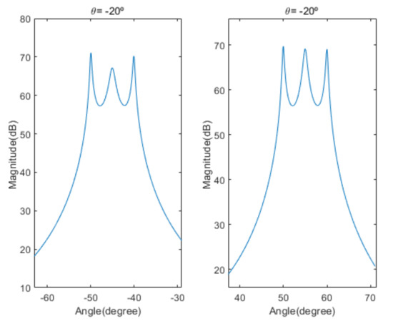 Although the estimation performance of the adjacent signal AOAs is enhanced as the number of antenna elements is increased, the computational complexity of estimation processing is dramatically increased [37]. Therefore, a technique for minimizing performance degradation and reducing the dimension of an antenna array with large number of elements is required to ensure high estimation performance of adjacent signal AOAs. The representative method to reduce the antenna array dimension is a linear transformation technique. Beamspace processing reduces the antenna dimension from an element space to a beamspace using linear transformation. The dimensional reduction by beamspace processing is performed by multiplying the conjugate transpose of the linear transformation matrix with size of (typically ), where is the number of antenna elements and is the dimension of the beamspace, by the received signal vector. To cover the entire array element dimension, multiple beamspace transformation matrices may be considered. Algorithms based on beamspace processing, such as Beamspace MUSIC [38], Beamspace root MUSIC [39], and Beamspace ESPRIT [40], have several benefits, including reduced computational complexity, improved resolution, and reduced estimation error [3,5,6,7,27,41]. The estimation performance of the Beamspace MUSIC algorithms can approach the Cramer–Rao Bound (CRB) if appropriate preprocessor settings are used [42].