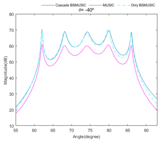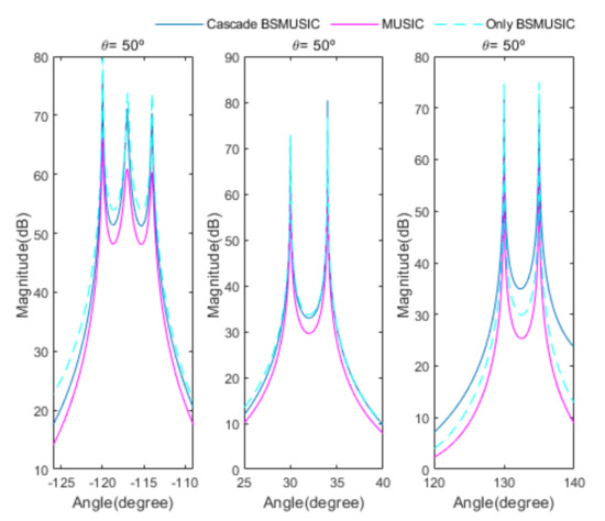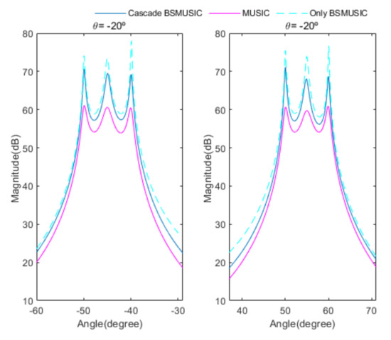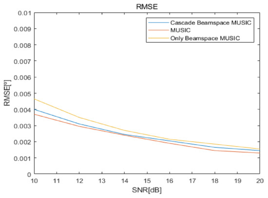 Figure 20 shows the root mean square error (RMSE) curves versus SNRs for the proposed cascade algorithm, MUSIC, and only Beamspace MUSIC, for the fourth scenario. RMSE is calculated by: