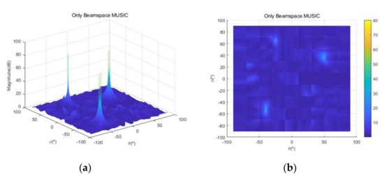 - Yeom, D.; Park, S.; Kim, J.; Lee, M. Performance analysis of beamspace MUSIC with beamforming angle. In Proceedings of the 2014 8th International Conference on Signal Processing and Communication Systems, Gold Coast, QLD, Australia, 15–17 December 2014; pp. 1–5. [Google Scholar]