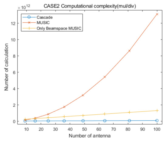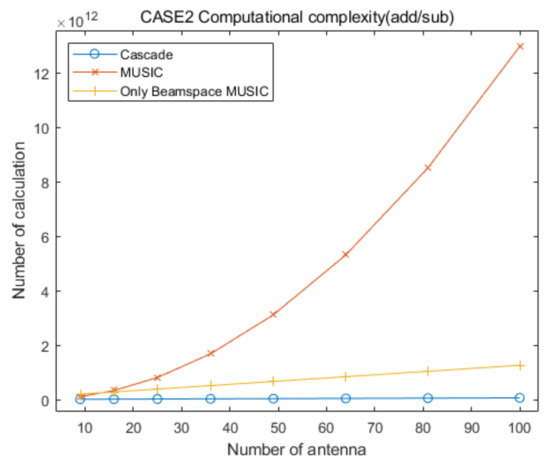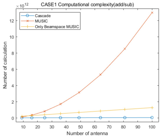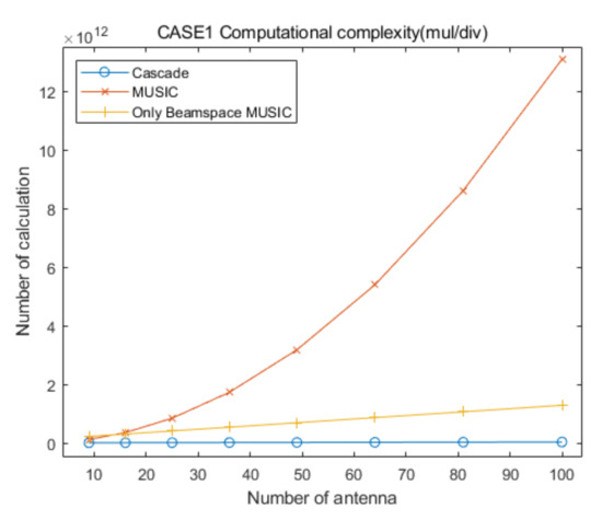 Based on the aggregation of the above content, we assume that the computational complexities for the generation of the covariance matrix and the eigenvalue decomposition for the proposed cascade algorithm, the general MUSIC algorithm, and the only Beamspace MUSIC algorithm, are similar. From the above content, we find that the computational complexity of the eigenvalue decomposition processing for the general MUSIC algorithm is much higher than that of the other algorithms, and that for the only Beamspace MUSIC algorithm is higher than or equal to that for Beamspace MUSIC in the proposed cascade algorithm. Therefore, we can ignore the computational complexity of the eigenvalue decomposition processing for the three algorithms because the goal of this section is to show that the computational complexity of the proposed cascade algorithm is lower than that of the general MUSIC algorithm and the only Beamspace MUSIC algorithm. In particular, we consider that their computational complexities are lower than those for the calculation of the spatial spectrum of CAPON, Beamspace MUSIC, and general MUSIC, for all of the elevation and azimuth angles. In conclusion, in this section we focus on the comparison of the computational complexities for searching AOAs based on the spatial spectrum of the proposed cascade algorithm, the MUSIC algorithm, and the only Beamspace MUSIC algorithm.