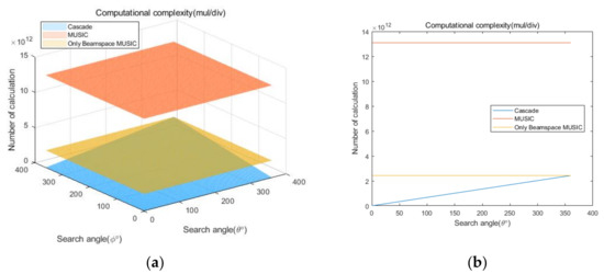 Curves for comparing addition/subtraction computational complexities of the proposed cascade algorithm, the general MUSIC algorithm, and only Beamspace MUSIC, according to the search range: (a) 3D, (b) side view.