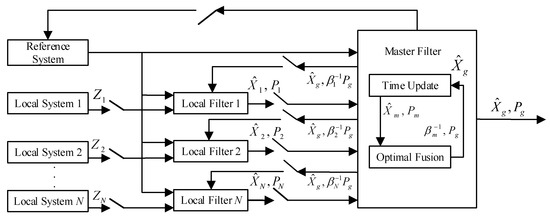 The federated Kalman filter contains a composite master filter and N independent local filters. The schematic diagram of the federated Kalman filter is presented in Figure 1. In summary, the implementation steps of the federated Kalman filter can be presented as follows: