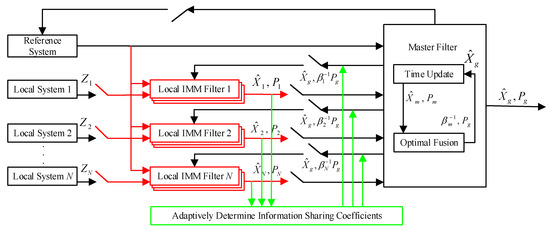 In general, the whole output results of the IMM algorithm are the combined values of all filters, and the weight factor of each filter is the model probability that represents the accuracy of the current motion state of the system. The schematic diagram of the proposed adaptive federated IMM filter is presented in Figure 2.