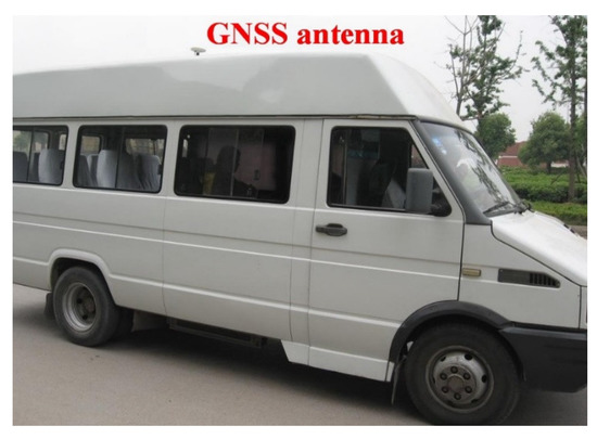 In the integrated navigation experiment, the test vehicle ran on the road, and the power source powered the SINS, the GNSS receiver, the odometer, and the high-accuracy GNSS/SINS reference baseline system. Then the real-time output data of the experimental integrated navigation system and the reference baseline system were transmitted to the navigation computer via communication lines. In the whole integrated navigation experiment, the navigation computer recorded the sensor data in real-time for subsequent processing.