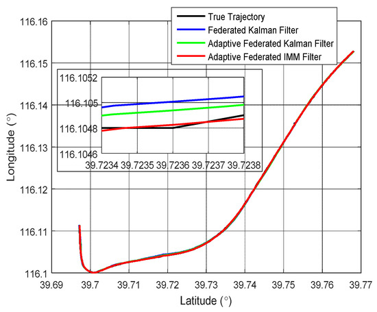 To compare the integrated navigation effect under different filtering methods, the federated Kalman filter, the adaptive federated Kalman filter, and the adaptive federated IMM filter were separately applied in the real experiment. The integrated navigation experiment lasted for 600 s. Figure 6 shows the estimation trajectories of the integrated navigation experiment by using the three filtering methods. In Figure 6, the black line represents the true trajectory, the blue line represents the estimation trajectory of the federated Kalman filter, the green line represents the estimation trajectory of the adaptive federated Kalman filter, and the red line represents the estimation trajectory of the adaptive federated IMM filter. It can be seen from Figure 6 that all three filtering methods can be used for integrated navigation. But from the partially enlarged figure, the estimation trajectory of the adaptive federated IMM filter is the closest to the true trajectory compared with the estimation trajectories of the adaptive federated Kalman filter and the federated Kalman filter. The estimation trajectory of the adaptive federated Kalman filter is closer to the true trajectory compared with that of the federated Kalman filter. It indicates that among the three filtering methods, the proposed adaptive federated IMM filter can achieve the highest accuracy of integrated navigation, and the adaptive federated Kalman filter is second, followed by the federated Kalman filter.