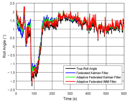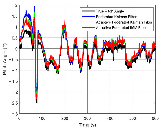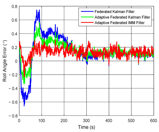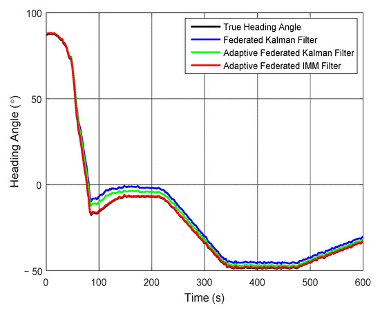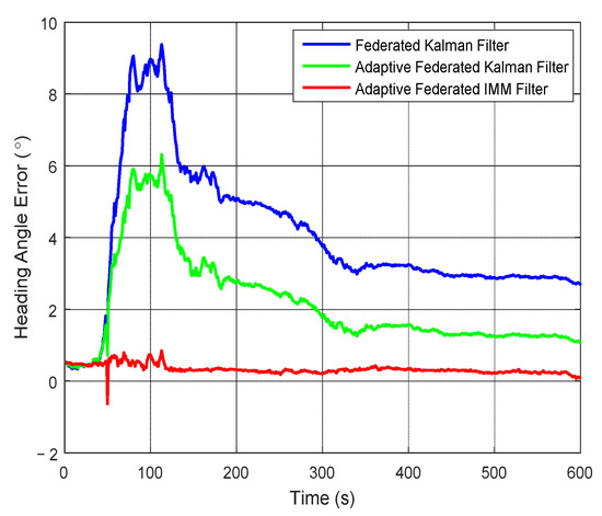 It can be seen from Figure 8 that the estimation values of heading angle error of the federated Kalman filter are the biggest. The estimation values reach the maximum value of 9.38° around 100 s, and after that they reduce to 2.68° at 600 s. The estimation values of the adaptive federated Kalman filter are smaller than that of the federated Kalman filter. Its estimation values reach the maximum value of 6.31° around 100 s, and after that they reduce to 1.05° at 600 s. Comparatively, the estimation values of the adaptive federated IMM filter is the smallest. Its estimation values reach the negative maximum value of −0.63° around 50 s, then after that the estimation values tend to stabilize around 0.26°, and they are little influenced by the change of external disturbances. This is because the proposed adaptive federated IMM filter uses different models for each local system, when the external disturbances change the model for each local system can switch in time. Therefore, the adaptive federated IMM filter can use the most accurate model to describe the current state of each local system, and the estimation values of heading angle error can be effectively reduced.