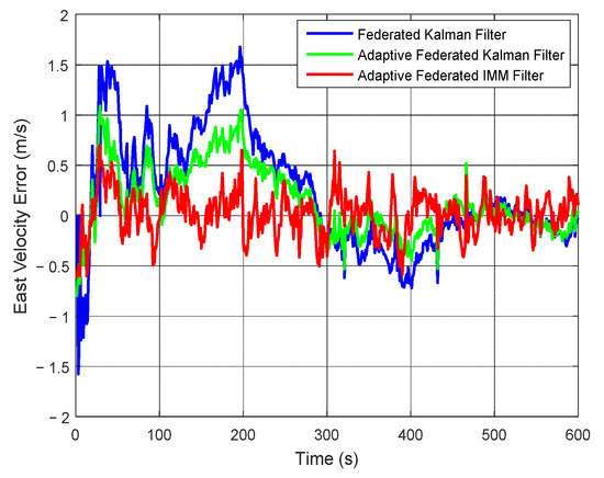 As shown in Figure 14, when using the federated Kalman filter, the estimation values of east velocity error have large fluctuations within 300 s, with a maximum value of 1.68 m/s around 200 s. When using the adaptive federated Kalman filter, the estimation values reach a maximum value of 1.05 m/s around 200 s, and the fluctuations are smaller than those of the federated Kalman filter. Comparatively, when using the adaptive federated IMM filter, the estimation values keep stable in the whole process, and its fluctuations are the smallest among the three filtering methods. This is because the proposed adaptive federated IMM filter can switch the model of each local system in time when the external disturbances change, and the most accurate model can be established to describe the current motion state.