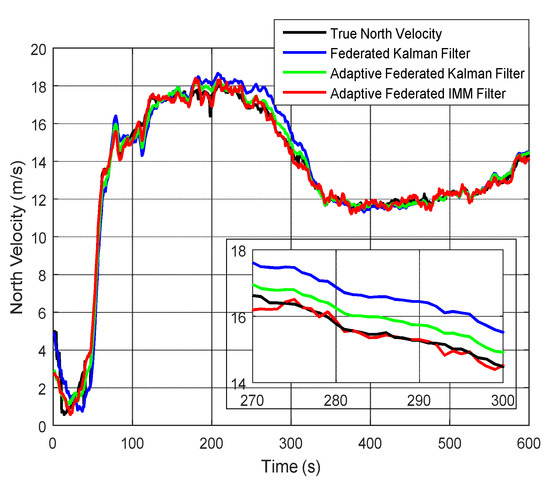 The estimation curves of north velocity and north velocity error are shown in Figure 15 and Figure 16, respectively. From Figure 15, the north velocity changes between 0 and 20 m/s. It can be seen from the partially enlarged figure that the estimation values of north velocity by using the adaptive federated IMM filter is the closest to the true north velocity compared with that by using the other two filtering methods.