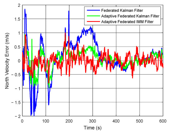 As shown in Figure 16, when using the federated Kalman filter, the estimation values of north velocity error have a couple of big fluctuations within 350 s, and the estimation values reach a negative maximum value of −1.99 m/s around 50 s. Therefore, its estimation values are greatly affected by the external noises during the integrated navigation experiment. When using the adaptive federated Kalman filter, the estimation values reach a negative maximum value of −0.99 m/s around 110 s, and the fluctuations are distinctly smaller than those using the federated Kalman filter. Comparatively, when using the adaptive federated IMM filter, its estimation values have the smallest fluctuations among all three filtering methods.