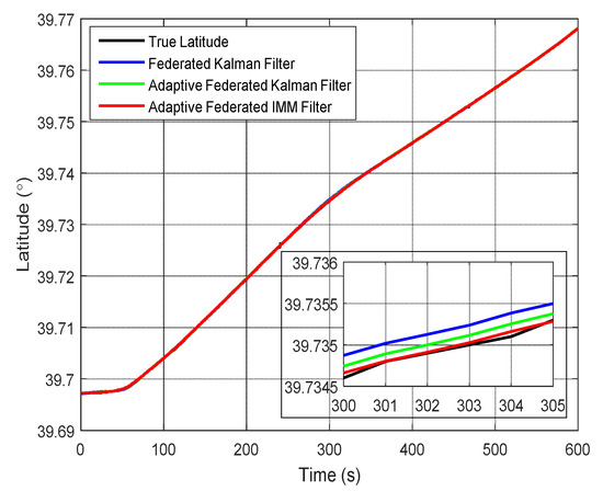 The estimation curves of latitude and latitude error are shown in Figure 17 and Figure 18, respectively. Because the position is the integral of velocity, the estimation curves of position are smoother than that of velocity. From Figure 17, the estimation curves by using all the filtering methods can track the change of latitude, but the estimation values of latitude by using the adaptive federated IMM filter are the closest to the true latitude among the three filtering methods.
