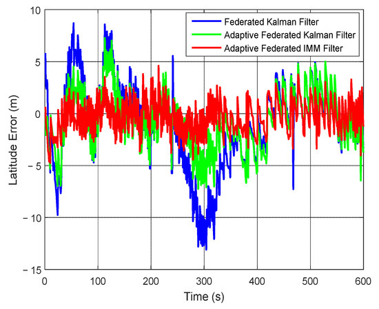 Moreover, it can be seen from Figure 20 that when using the federated Kalman filter the estimation values of longitude error reach a maximum value of 37.44 m around 200 s, and they are greatly affected by the external disturbances. When using the adaptive federated Kalman filter, the estimation values reach a maximum value of 27.59 m around 200 s, and they are less affected by the external disturbances than that using the federated Kalman filter. Comparatively, when using the adaptive federated IMM filter, the estimation values of longitude error are the least affected by the external disturbances and they keep stable in the whole process of integrated navigation.