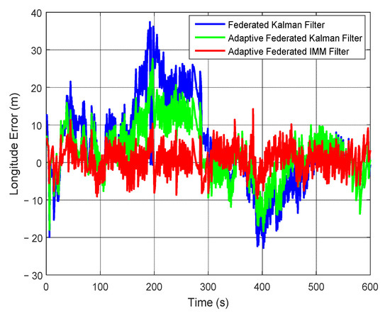 From Figure 18, the estimation values of latitude error by using the federated Kalman filter exist big fluctuations and they reach a negative maximum value of −13.10 m around 300 s. The estimation values by using the adaptive federated Kalman filter reach a maximum value of 7.29 m around 100 s, and its estimation values have smaller fluctuations than that using the federated Kalman filter. In contrast, when using the adaptive federated IMM filter, the estimation values of latitude error are distinctly more stable than that using the other two filtering methods.