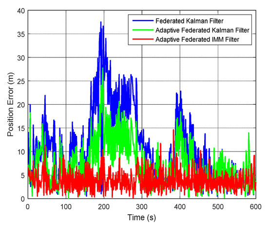 Consequently, the estimation curves of position error are shown in Figure 21. It can be seen that the estimation curves of position error of the federated Kalman filter have some large fluctuations during the 600 s of integrated navigation, and its estimation values reach a maximum value of 37.49 m around 200 s. When using the adaptive federated Kalman filter, the estimation values reach a maximum value of 27.73 m around 200 s, and the fluctuations are smaller than that using the federated Kalman filter. By contrast, when using the adaptive federated IMM filter, the estimation values of position error are the least affected by the external disturbances, and the fluctuations are the smallest among the three filtering methods. The mean absolute errors (MAEs) of position error when using the federated Kalman filter, the adaptive federated Kalman filter, and the adaptive federated IMM filter are 10.87 m, 7.36 m, 3.82 m, respectively. As a result, the position error when using the adaptive federated IMM filter was reduced by 64.86% and 48.10%, respectively, compared with the federated Kalman filter and the adaptive federated Kalman filter. In summary, the MAEs and standard deviations (STDs) of integrated navigation errors when using the three filtering methods are listed in Table 2.