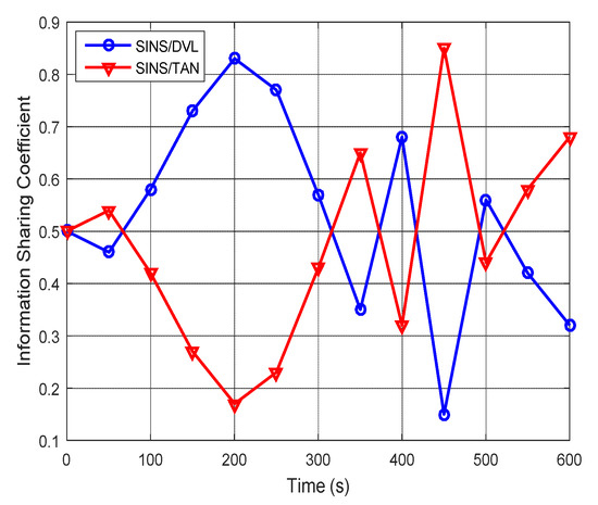 In the AUV integrated navigation experiment, the external environment is complex and time-varying, and the disturbances in the underwater environment are bigger than those on the land. Therefore, the outputs of the DVL and the TAN are easily disturbed by the underwater environment, and the output accuracy of the DVL and the TAN is decreased and is unstable. When the beams of the DVL are unable to reach the seabed, the accuracy of the SINS/DVL measurement model is decreased. When the underwater map information is inaccurate in some places, or the underwater terrain is relatively flat, the SINS/TAN measurement model is unable to provide accurate position information. To solve this problem, the proposed adaptive federated IMM filter is designed to adaptively adjust the information sharing coefficients of the local SINS/DVL system and the local SINS/TAN system during the integrated navigation experiment. Figure 22 shows the values of the information sharing coefficient in the adaptive federated IMM filter. It can be seen that, when the performance of each local system changes, the information sharing coefficients of the local SINS/DVL system and the local SINS/TAN system are adjusting in real time.