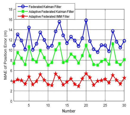 In order to further compare the federated Kalman filter, the adaptive federated Kalman filter, and the adaptive federated IMM filter in the process of integrated navigation, this study designed a total of 30 groups of vehicle integrated navigation experiments on a real platform. The test vehicle’s moving trajectories, running speeds, and conditions of the road surface are entirely different in those experiments. In each experiment, the SINS, GNSS receiver, odometer were restarted before working. The line charts of the MAEs of position errors in 30 groups of integrated navigation experiments are shown in Figure 25, and the MAEs of position errors in 30 groups of integrated navigation experiments are listed in Table 4.
