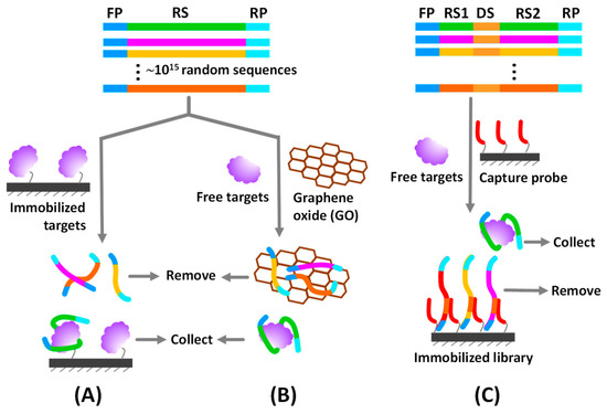 Schematic representation of common aptamer library designs and isolation concepts: (A) target immobilization, (B) immobilization-free and (C) library immobilization approaches (III). FP and RP, forward and reverse primer binding regions; RS, random sequence region, with RS1 and RS2 denoting random sequences at locations 1 and 2; DS, a docking sequence used for complementary binding with capture probe.