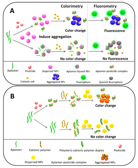 Schematic representation of general concept of nanoparticle-based colorimetric aptasensors for pesticide detection. (A) Color production is realized by salt-induced nanoparticle (NP) aggregation, which can be further extended to a fluorometric system by NP-induced fluorescence quenching. (B) Important role of cationic polymers in triggering NP aggregation in colorimetric pesticide aptasensors.