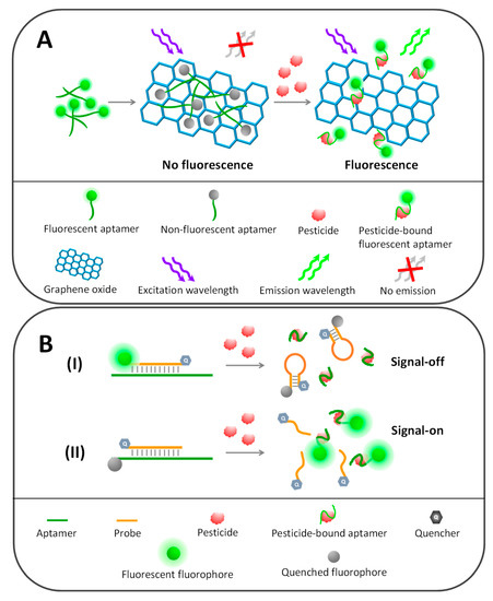 Schematic representation of fluorometric aptasensors for pesticide detection. (A) Fluorescence quenching and aptamer binding properties of graphene oxide and related carbon nanomaterials. (B) Fluorescent aptasensors using complementary probes: dual-labelled (I) and single-labelled (II) fluorescent probe.