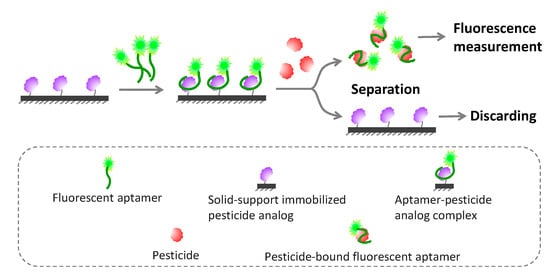 Recently, fluorescent aptamer-immobilized magnetic nanoparticles were fabricated for multiplex monitoring of pesticides (trichlorfon, glyphosate and malathion). The supernatant containing pesticide-bound fluorescent aptamers could be collected and fluorescence intensity could be measured after simply discarding the magnetic beads bearing unbound aptamers, which provided LOD for trichlorfon, glyphosate and malathion at 72.20, 88.80 and 195.37 ng/L, respectively [106]. Instead of using complementary DNA as a capture probe, Cao et al. demonstrated the proof of concept of a fluoroacetamide aptasensor by immobilizing the fluoroacetamide analog on a microplate to capture the aptamer sequences in place. The fluoroacetamide analyte competed with its immobilized analog to bind to and strip off the aptamers from the microwell into the supernatant, which could be taken to easily monitor fluorescence intensity [47].